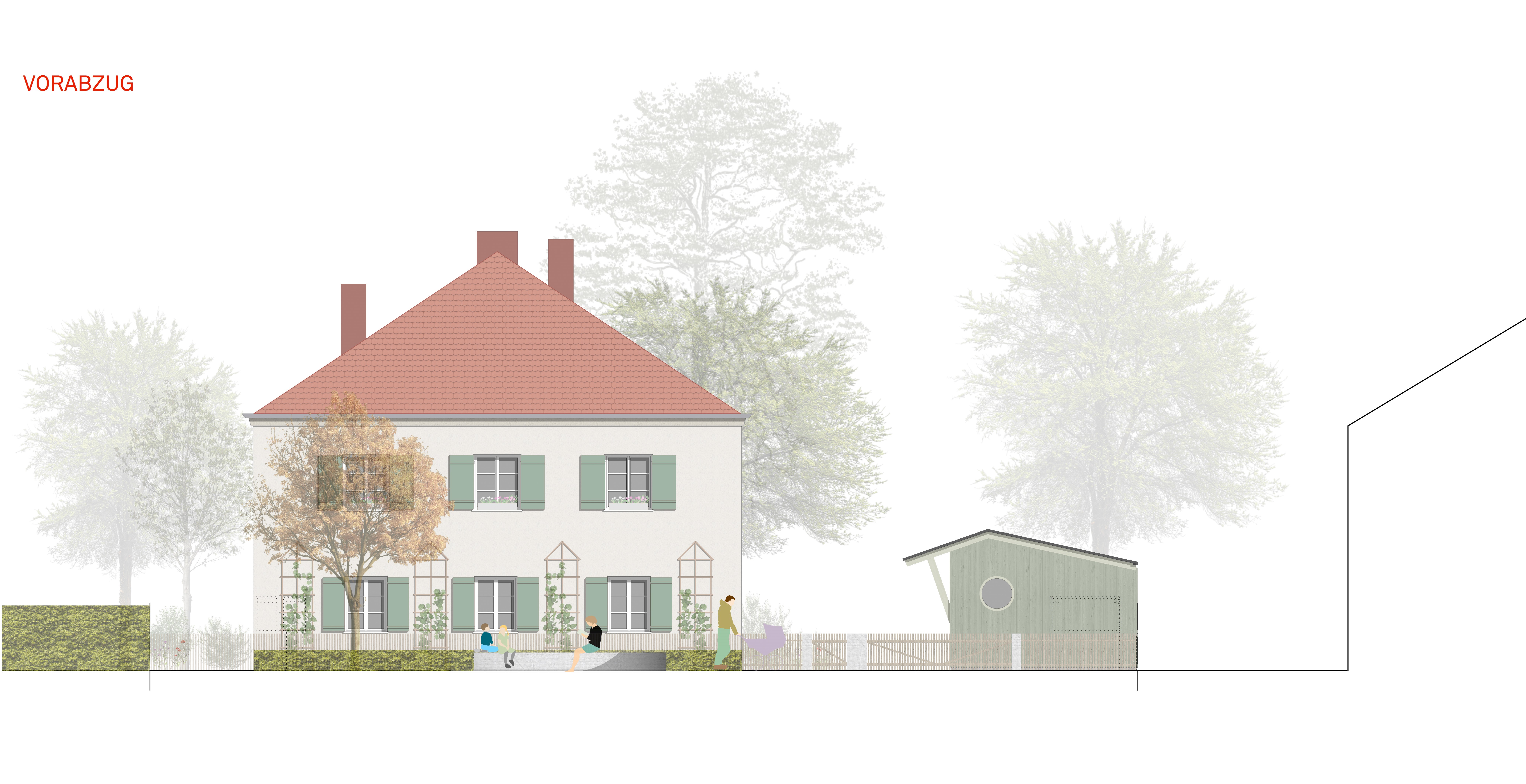 Das historische Bild des Gebäudes soll durch erneuerte, auf ihr historisches Maß zurückgeführte Fenster, Fensterläden sowie durch Obstspaliere wiederhergestellt werden. Die energetische Erneuerung erfolgt durch den Einbau einer Wärmepumpe und Innendämmung. Der L-förmige Anbau aus den 1950er Jahren wird durch einen separaten Multifunktionssaal ersetzt, der nicht nur durch das BRK als jetzigem Nutzer, sondern langfristig auch durch Aubinger Vereine nutzbar ist. Der rückwärtig gelegene Garten mit seinem hochwertigen Baumbestand bleibt erhalten, lediglich die Übergänge vom Gebäude zum Garten sowie die Wege mit Sitzgelegenheiten werden behutsam erneuert. Der Vorgarten wird nach historischen Vorbildern und mit Sitzgelegenheiten aufgewertet. Die abgebildete Visualisierung zeigt die geplante Fassadenansicht und den geplanten Neubau.