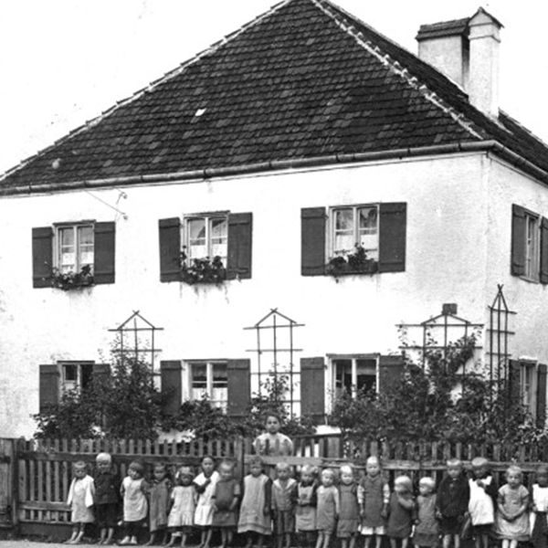 1822 ursprünglich als Schulhaus errichtet, hatte das Gebäude bisher viele verschiedene Funktionen inne. Heute befindet sich dort die Bereitschaft Aubing des Bayerischen Roten Kreuzes. Als eines der prägenden Gebäude innerhalb des Dorfkern-Ensembles gehört es für viele Aubinger*innen zum festen Bestandteil des Ortsbildes. Die alte Fotografie aus dem Aubinger Archiv zeigt die Fassade um 1920, mit ortstypischen Fensterläden, Obstspalieren und Holzstaketenzaun.